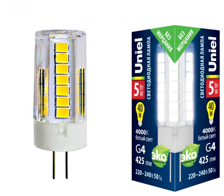 Отзывы на Светодиодная лампа Uniel LED-JC-220/5W/4000K/G4/CL GLZ09TR прозрачная. Белый свет (4000К). Картон. ТМ .