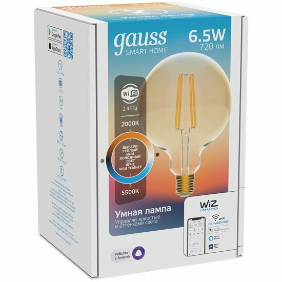 Умная лампа Wi-Fi Gauss Smart Home Filament G95 7W 740лм E27 управление голосом/смартфоном, с изменением температуры, диммируемая информация: