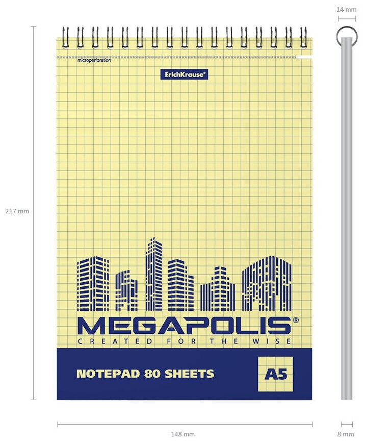 Блокнот А5 80л ErichKrause® MEGAPOLIS® Yellow Concept клетка, желтый внутренний блок, микроперфораци информация: