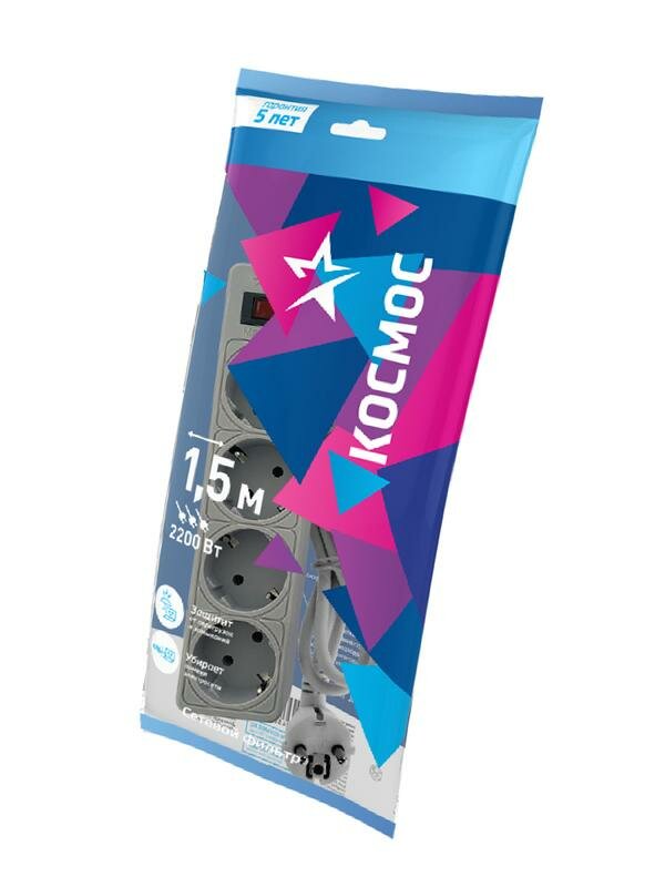 КОСМОС Удлинитель с сетевым фильтром 4х1.5м с заземл. 10А IP20 2.2кВт с предохранителем 3х0.75 индикатор сети сер. | код FKsm1.5m-4g(G) | космос (1 шт.)