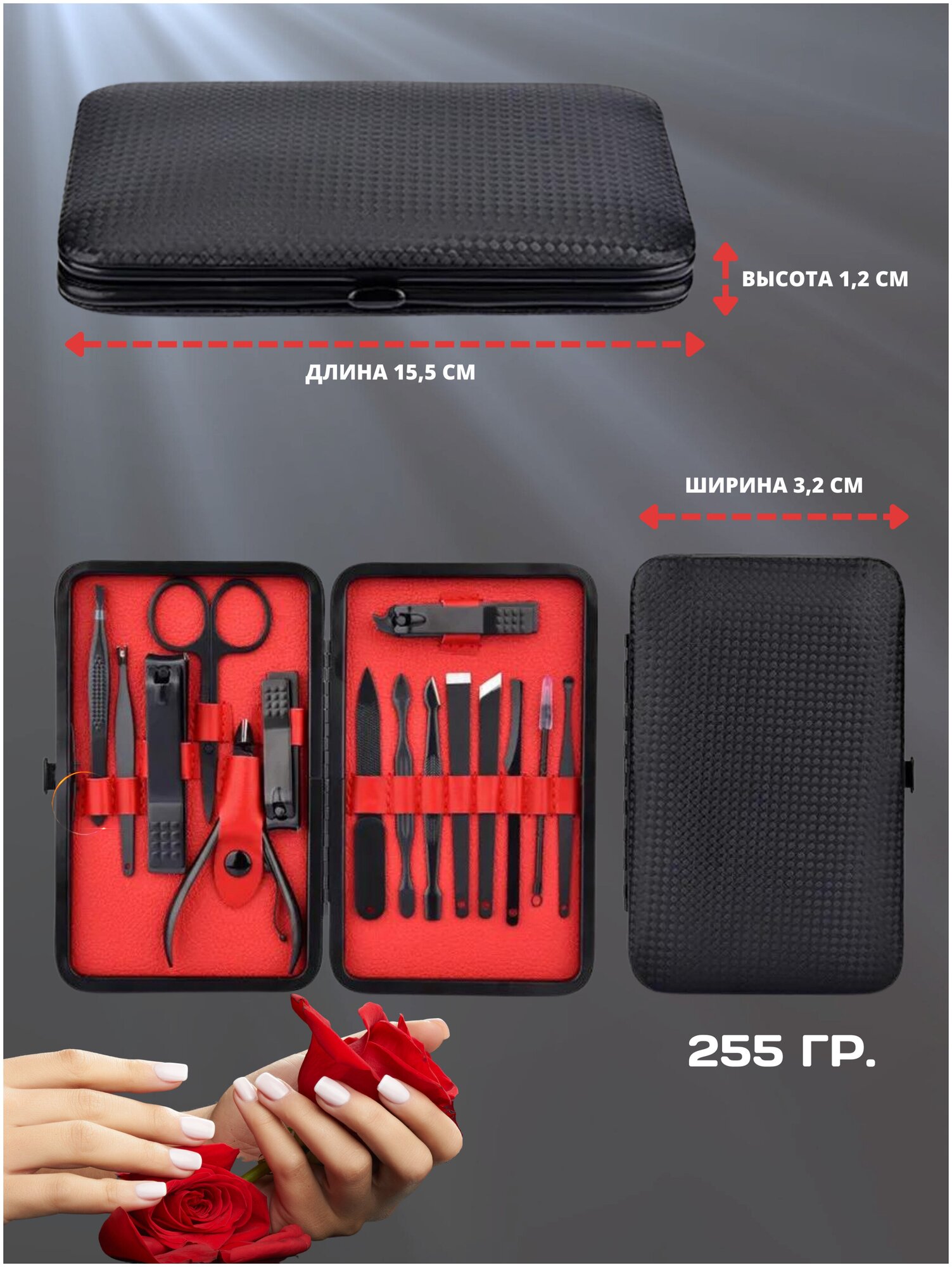 | Состав набора | книпсер, косметическая петля, кусачки для кутикулы, кусачки для маникюра, кусачки для педикюра, лезвия, лопатка маникюрная, ножницы для кутикулы, ножницы для ногтей, ножницы для педикюра, пилка, пилка педикюрная, пинцет, скребок |