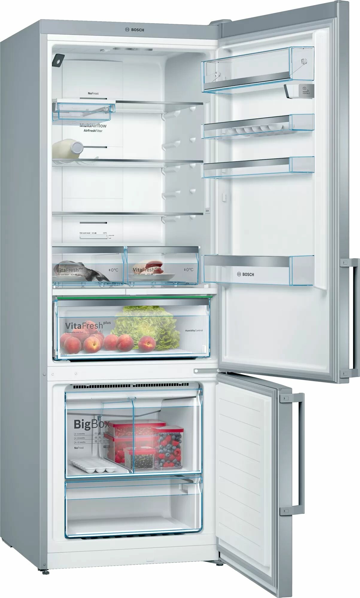 Отдельностоящий холодильник с морозильной камерой снизу Bosch KGN56HI30M Series 6, 1930x700x800, 417/142 л, 42 дБ, NoFrost, Home Connect, MultiAirFlow информация: