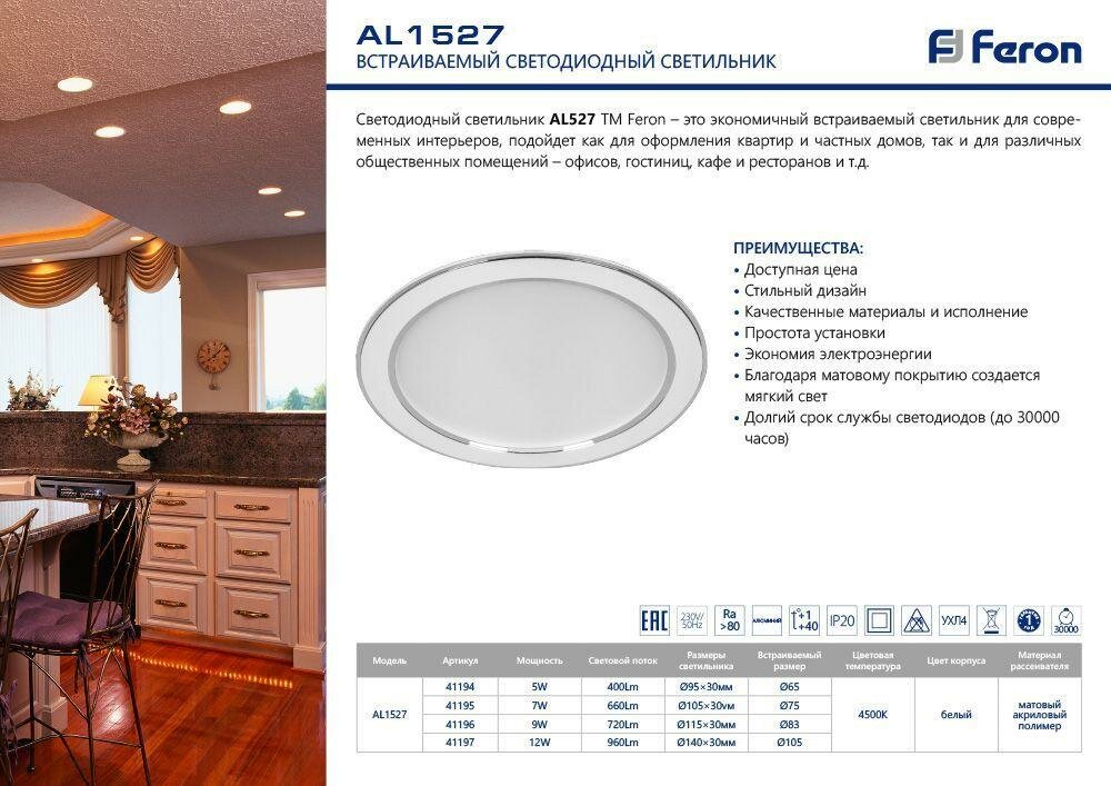 Мы выбрали 10 лучших цен на Feron Встраиваемый светодилдный светильник Feron AL1527 41195. Перед тем как купить Feron Встраиваемый светодилдный светильник Feron AL1527 41195 посмотрите найденные предложения из Яндекс Маркета и других сайтов на основе XML фидов.