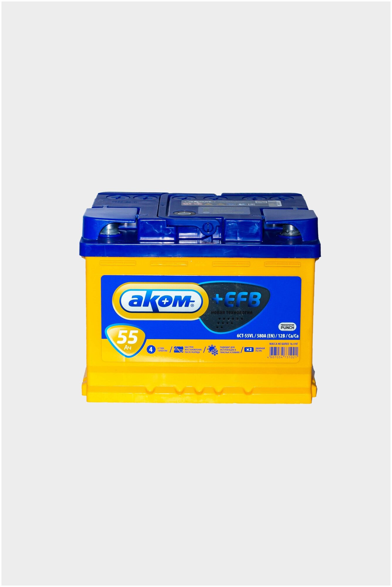 Батарея аккумулятор АКОМ + EFB 55 Ah 560 А автомобильный прямой полярности 55 ампер 12 v вольт под клемы, внешний свинцово кислотный заряженный, аккумуляторы для легковых автомобилей информация: