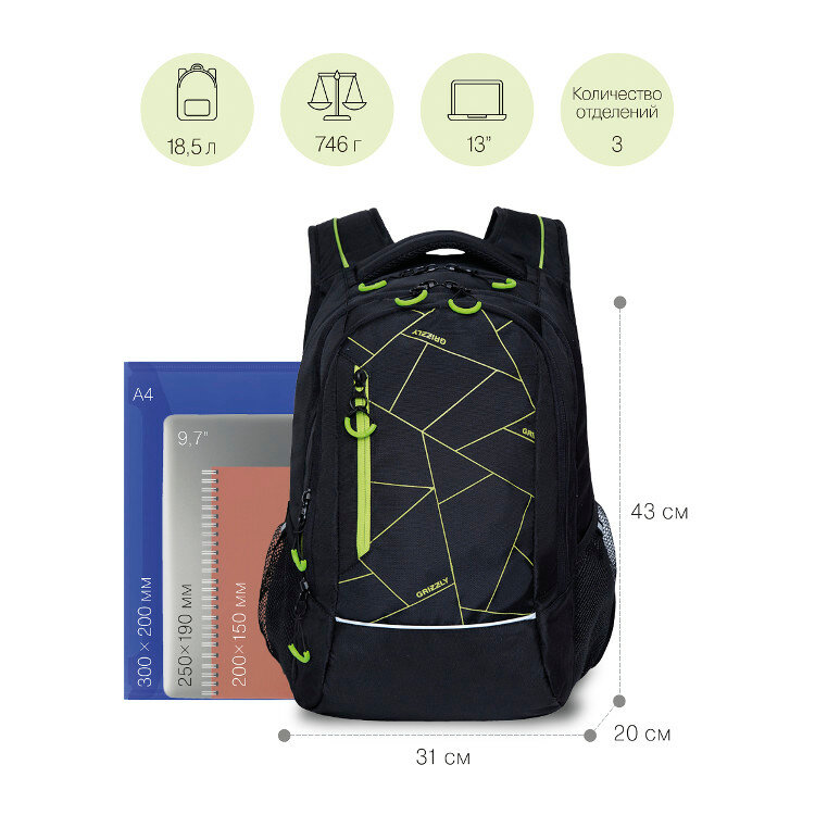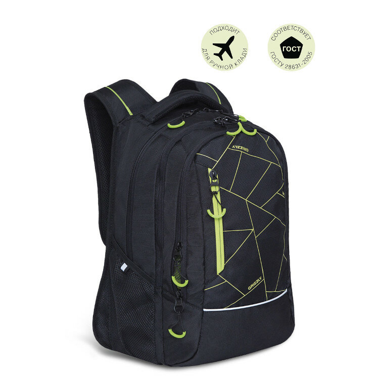 Рюкзак молодежный/школьный/подростковый для учебы, спортивный, городской Grizzly RU-138-41 черный - салатовый, с анатомической спинкой, 3 отделения для школьников и студентов