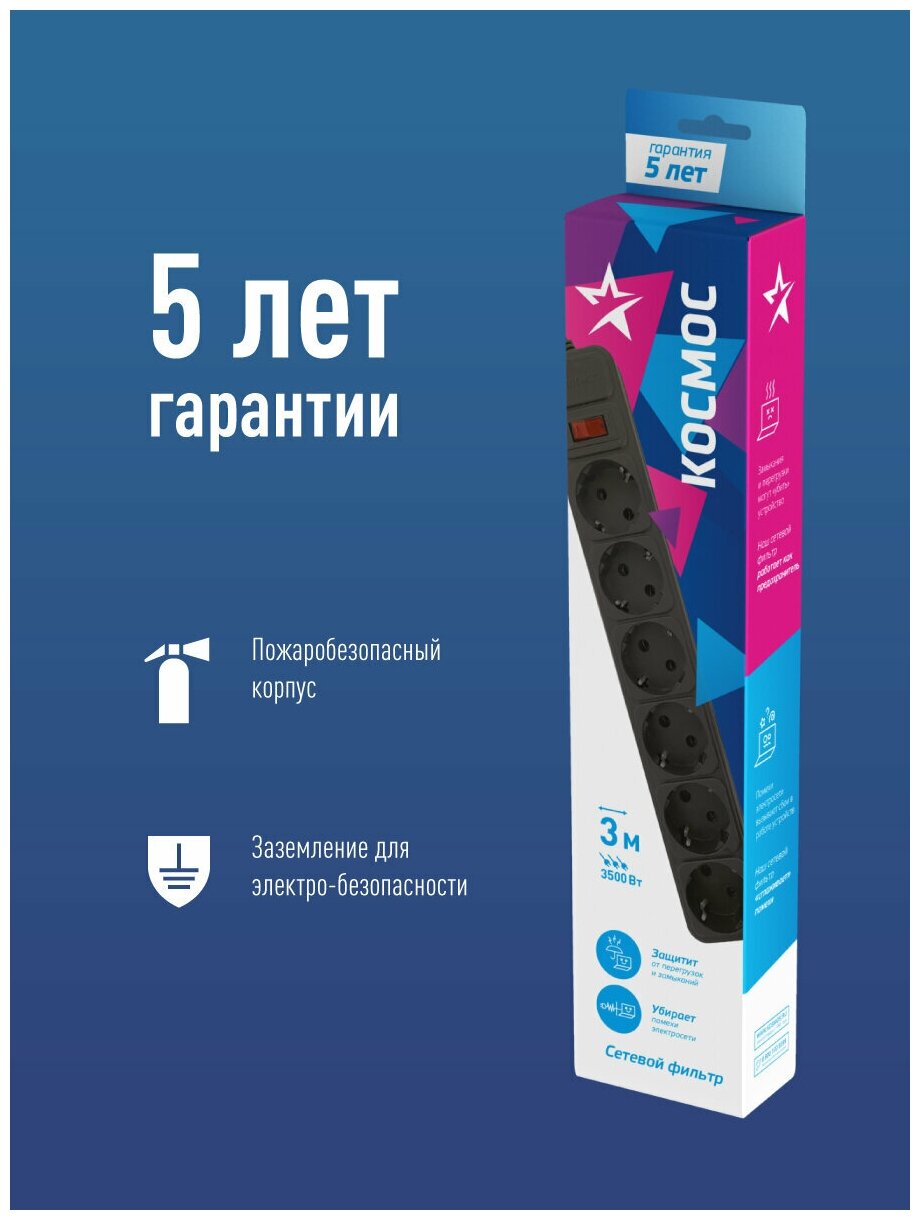 Сетевой фильтр Космос 3м 6 гнезд, черный