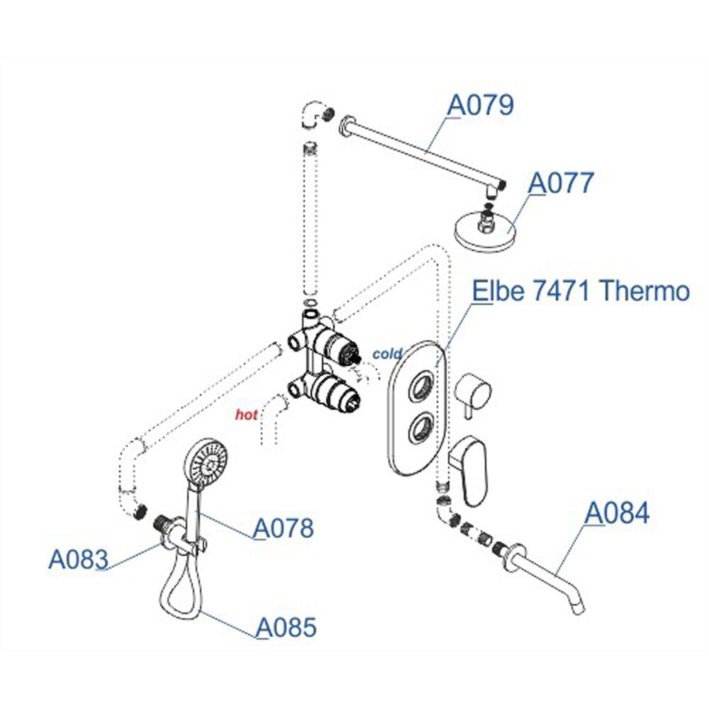 | Комплектация | смеситель для ванны и душа Elbe 7471 / Подключение шланга A083 / шланг для душа А085 / Верхняя душевая насадка A077 / Настенный верхний излив для душа A079 / Лейка 3-функциональная A078 / Настенный излив для ванны A084 |