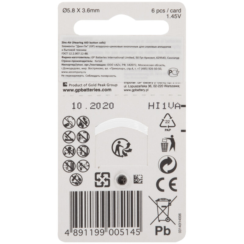Батарейка GP ZA10F (PR70, AC10, DA230) воздушно-цинковая, BC6 информация: