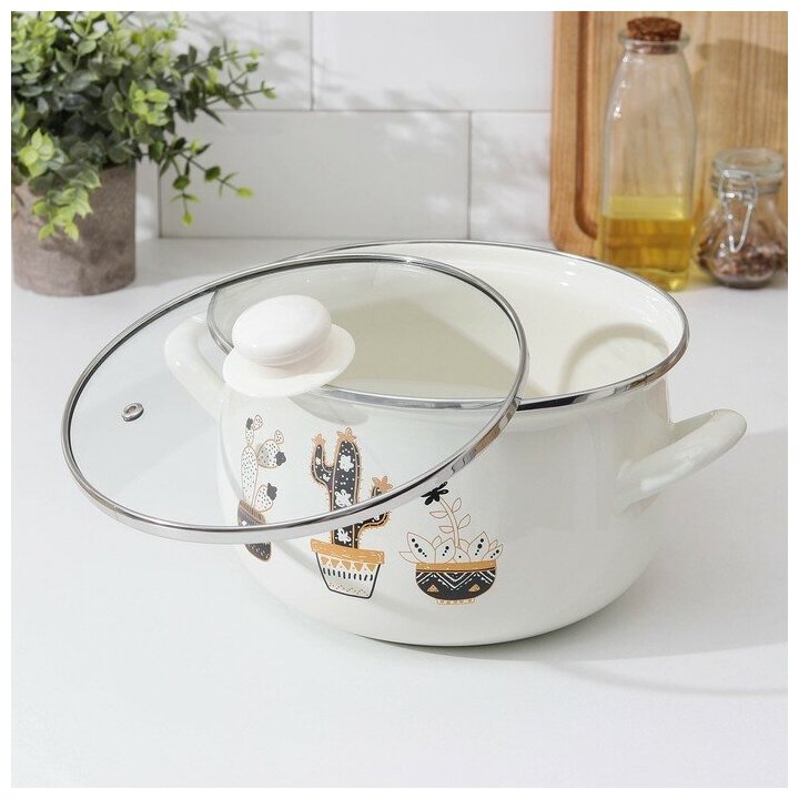 Кастрюля эмалированная 1,5 л с ободком белая с рисунком Фруктовая фантазия
