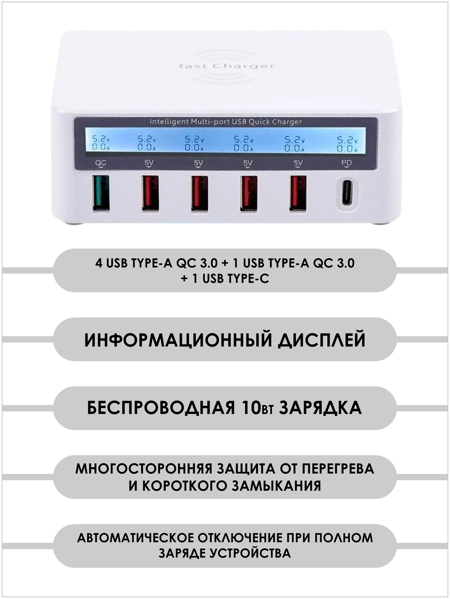 Мульти Зарядное устройство 50 Вт для телефона смартфона QC 3.0, быстрая зарядка, беспроводная, сетевое, type-c, USB-A информация: