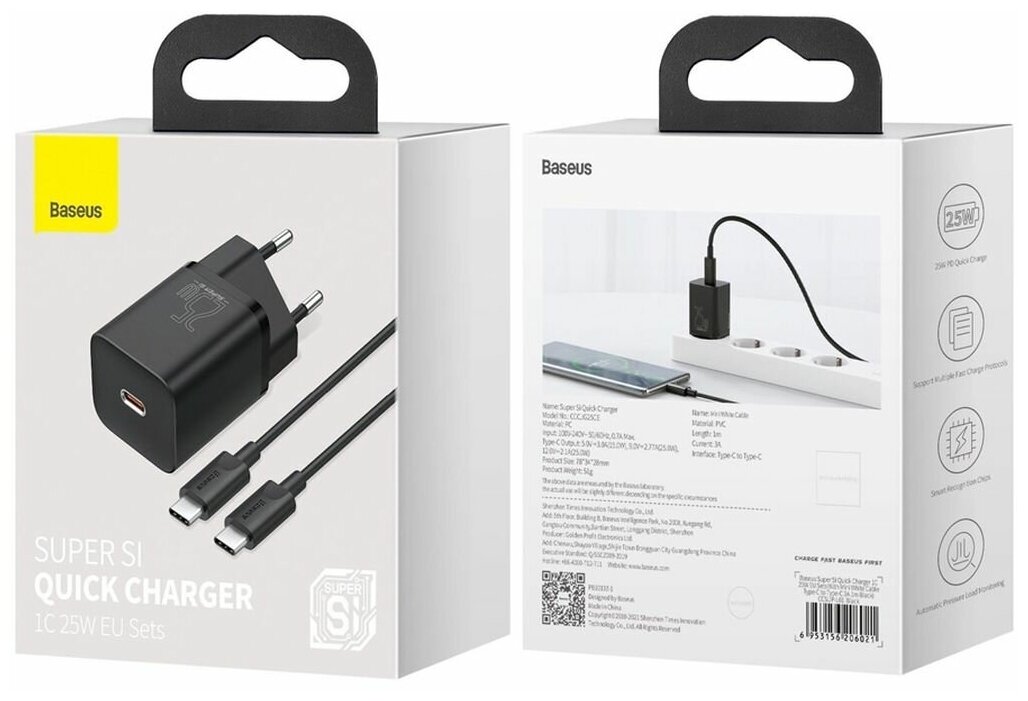 Сетевое зарядное устройство Baseus Super Si Quick Charger 1C 25W EU Sets Черное (With Mini Cable Type-C - Type-C 3A 1m) (TZCCSUP-L01) информация: