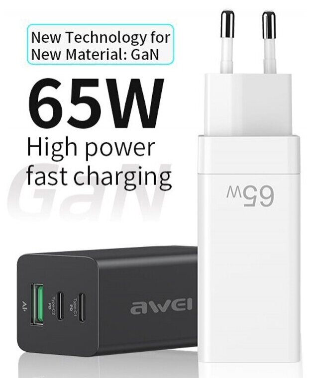 Зарядка для телефона Awei 65W 2Type-C + 1USB белая High Powered PD9 информация: