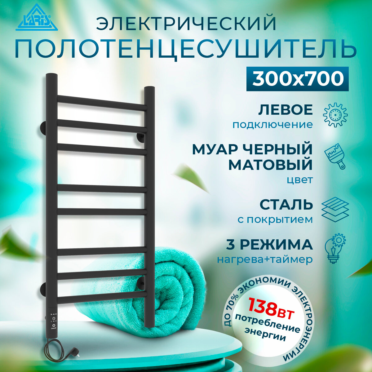 Отзывы на Полотенцесушитель электрический Laris Лаванда ЧКЧ П8 300х700 мм левое подключение RAL 9005 (черный матовый муар) с таймером и терморегулятором