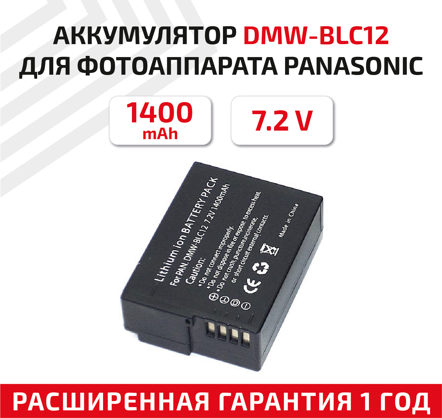 Аккумулятор (АКБ, аккумуляторная батарея) DMW-BLC12 для фотоаппарата Panasonic Lumix DMC-FZ200, 7.2В, 1200мАч, Li-Ion информация: