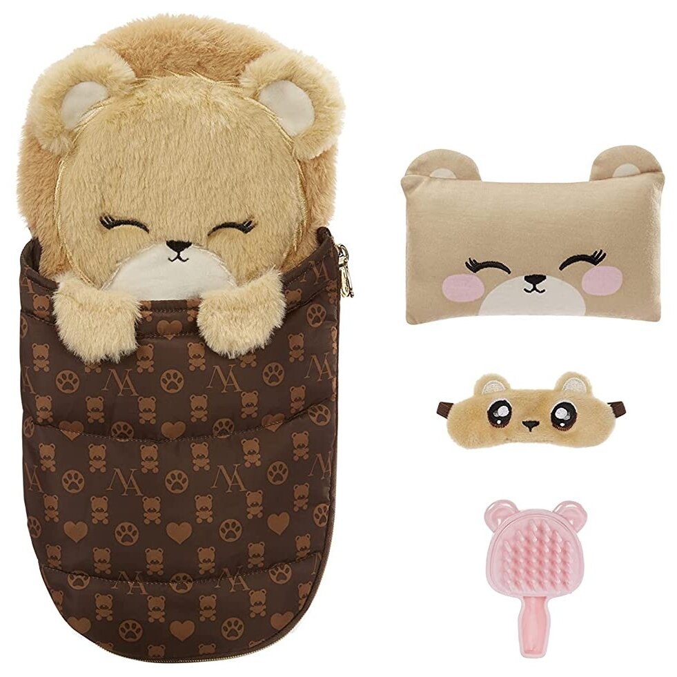 | Комплектация | большая кукла Лара Вонн, атласная пижама, состоящая из кофточки и шортиков, ворсистые тапочки-медвежата, меховая маска для сна, спальный мешок с пушистой подкладкой и принтом в стиле Louis Vuitton, подушка в виде мордочки мишки, розовая щётка для расчёсывания, 2 резинки для волос с украшениями-мишками |