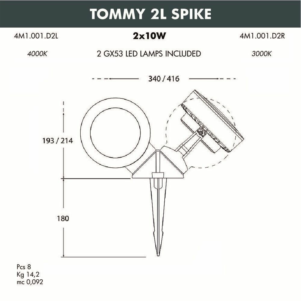 Ландшафтный светильник Fumagalli Tommy 2L Spike 4M1.001.000.AXG2R, Черный и Прозрачный, с лампой 350Lm, 3000К информация: