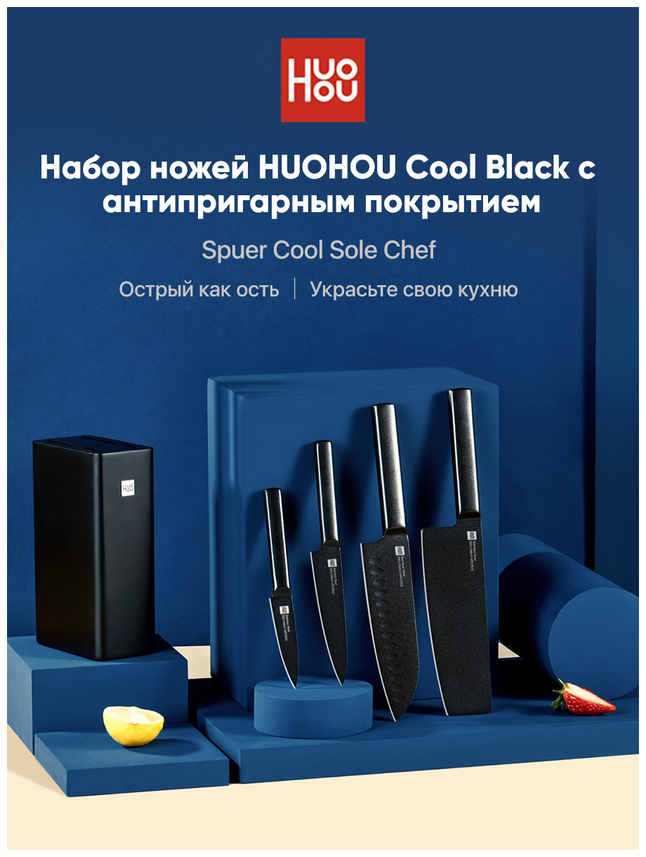 Отзывы на Набор стальных ножей (4 ножа + подставка) Huohou 5-Piece Non-Stick Kitchen Kinfe Set (HU0076), русская версия!!!, черный
