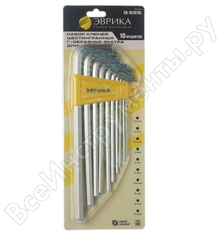 ER15101XL эврика Набор ключей шестигранных 1.5-10мм Г-образных экстрадлинных 10 предметов эврика