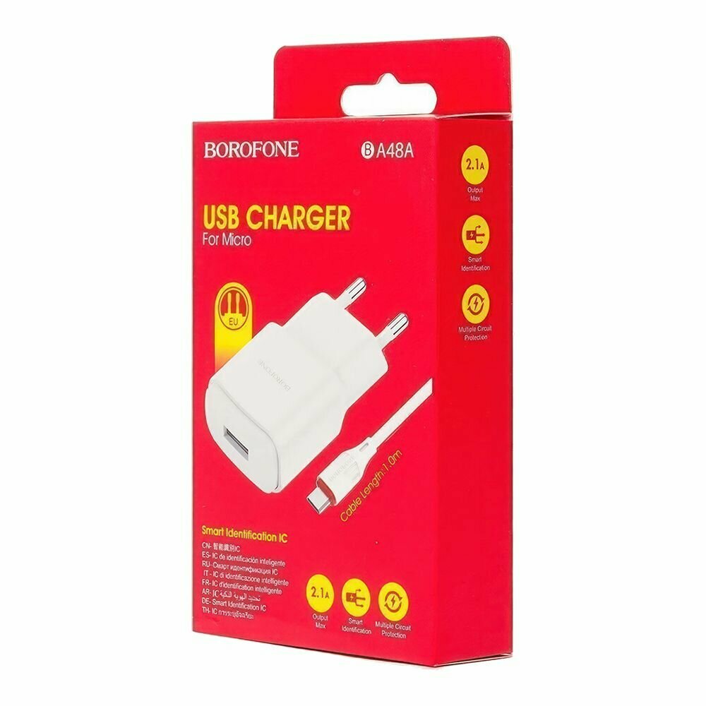 Сетевое зарядное устройство (СЗУ) Borofone BA48A (USB) + кабель MicroUSB, 2.1 А, белый