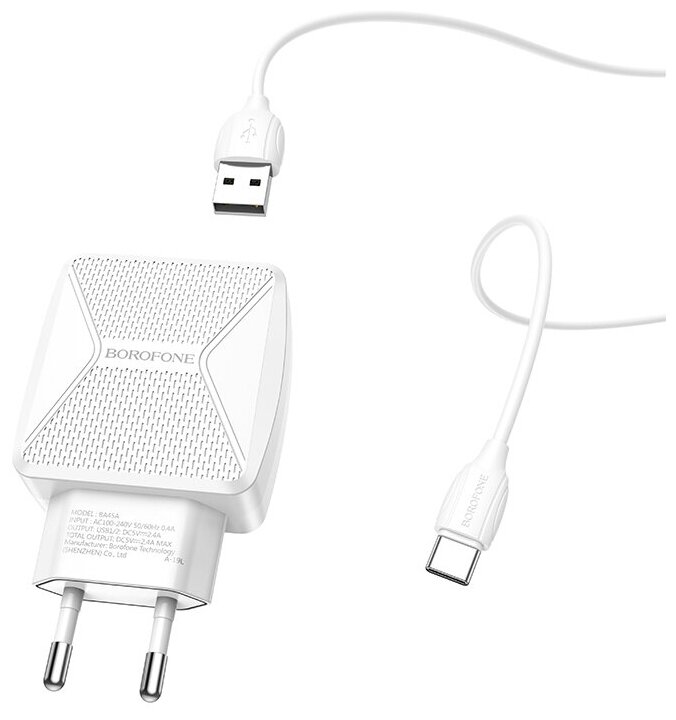 Зарядное устройство BOROFONE BA45A Max 2*USB + Кабель USB-Type-C, 2.4A, белый информация: