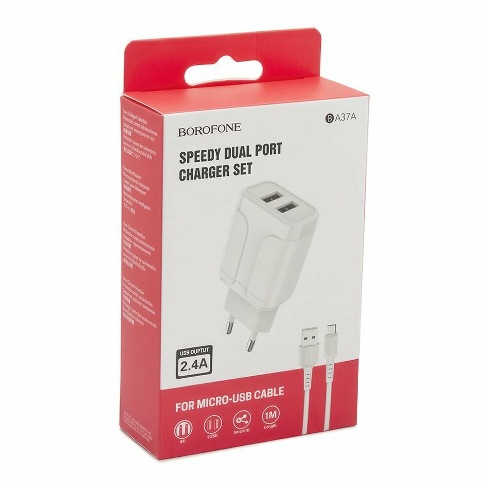 Сетевое зарядное устройство (СЗУ) Borofone BA37A (2 USB) + кабель MicroUSB, 2.4 А, белый