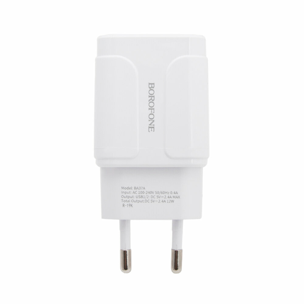 Блок питания сетевой 2 USB Borofone, BA37A, 2.4A, пластик, кабель микро USB, цвет: белый