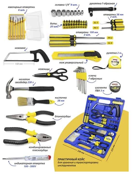 | Инструменты в комплекте | отвёртки / плоскогубцы / длинногубцы / ножовка по дереву / отвёртки для точных работ / рукоять для головок / рулетка / ключи г-образные / кисточка / Изолента / ножницы / нож / молоток-гвоздодер |