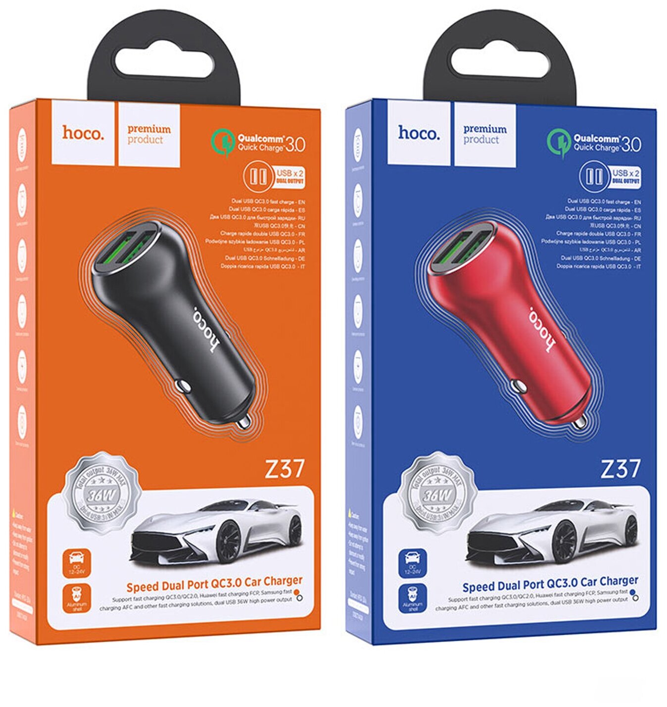 10 цен на Автомобильное зарядное устройство Hoco Z37 Sharp speed dual port QC3.0 car charger (2USB: 3.6V-6.5V & 3A) Черный