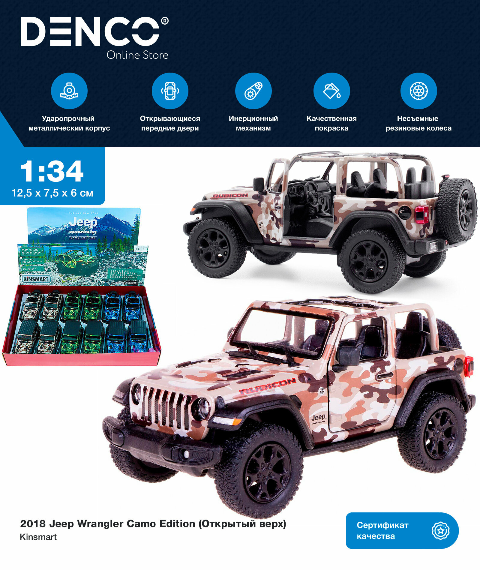 Отзывы на Металлическая машинка Kinsmart 1:34 "2018 Jeep Wrangler Camo Edition (Открытый верх)" KT5420DA, инерционный / Коричневый