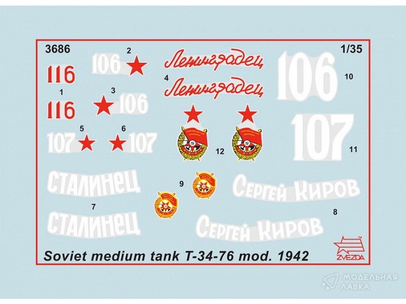 | Дополнительная информация | люки выполнены отдельными деталями; нейлоновая сетка для вентиляционных решёток, нить для имитации буксировочного троса; декаль для 3 вариантов: Т-34 №107 «Сергей Киров» из состава 1-й Ленинградской Краснознаменной танковой бригады, Ленинградский фронт январь-февраль 1943 г., Т-34 №106 «Сталинец» из состава 1-й Ленинградской Краснознаменной танковой бригады, Ленинградский фронт весна 1943 г., Т-34 № 116 «Ленинградец» из состава 1-й Ленинградской Краснознаменной танковой бригады, Красное село, январь 1944 г. |