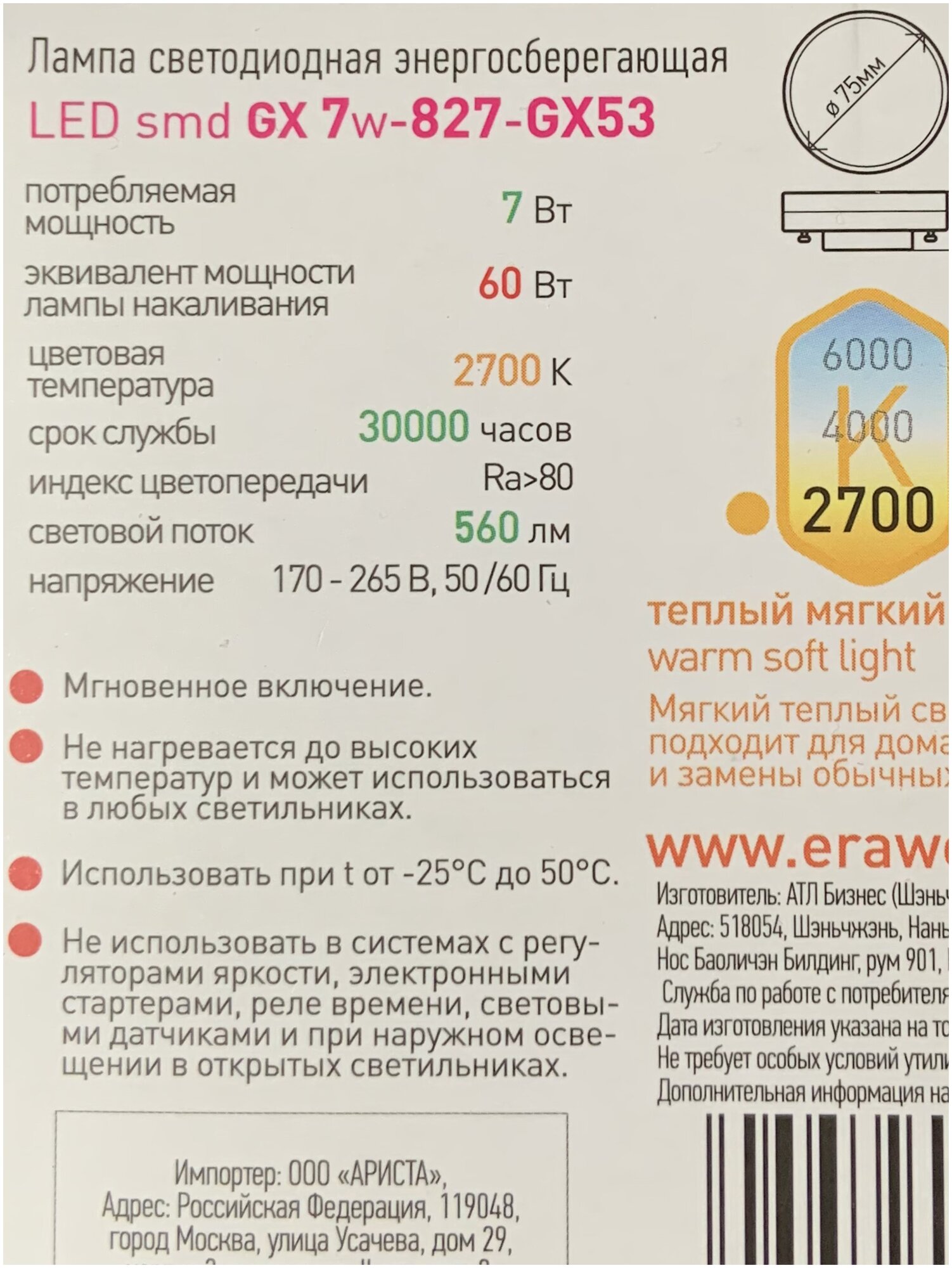 | Эквивалент лампы накаливания | 60 Вт |