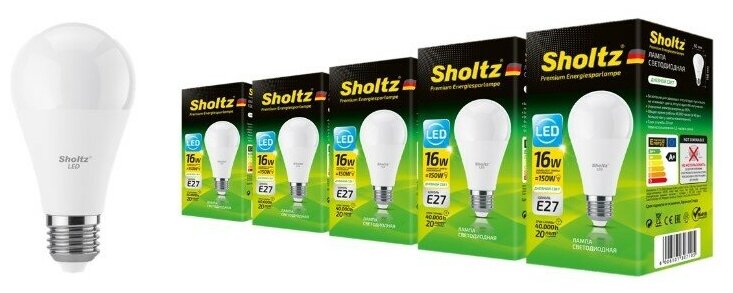 Отзывы на Комплект из 5 светодиодных энергосберегающих ламп Sholtz груша A60 16Вт E27 4200К 220В пластик (Шольц) LEB3071P