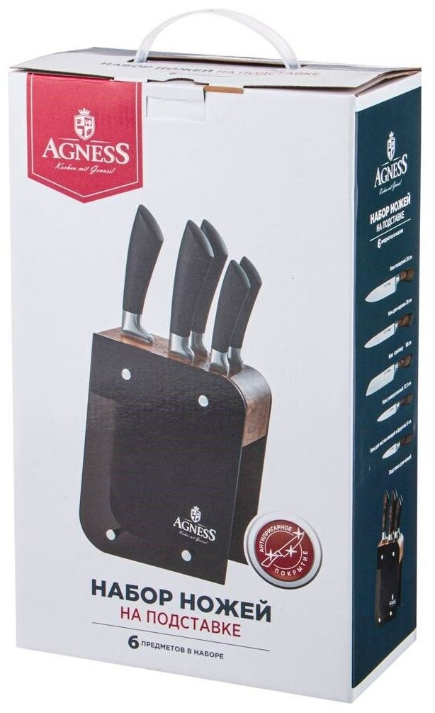| Комплектация | Нож поварской 20см, Нож для нарезки 20см, Нож для хлеба 20см, Нож универсальный 12,5см, Нож для чистки овощей и фруктов, 9см, Удобная пластиковая подставка для безопасного хранения ножей |