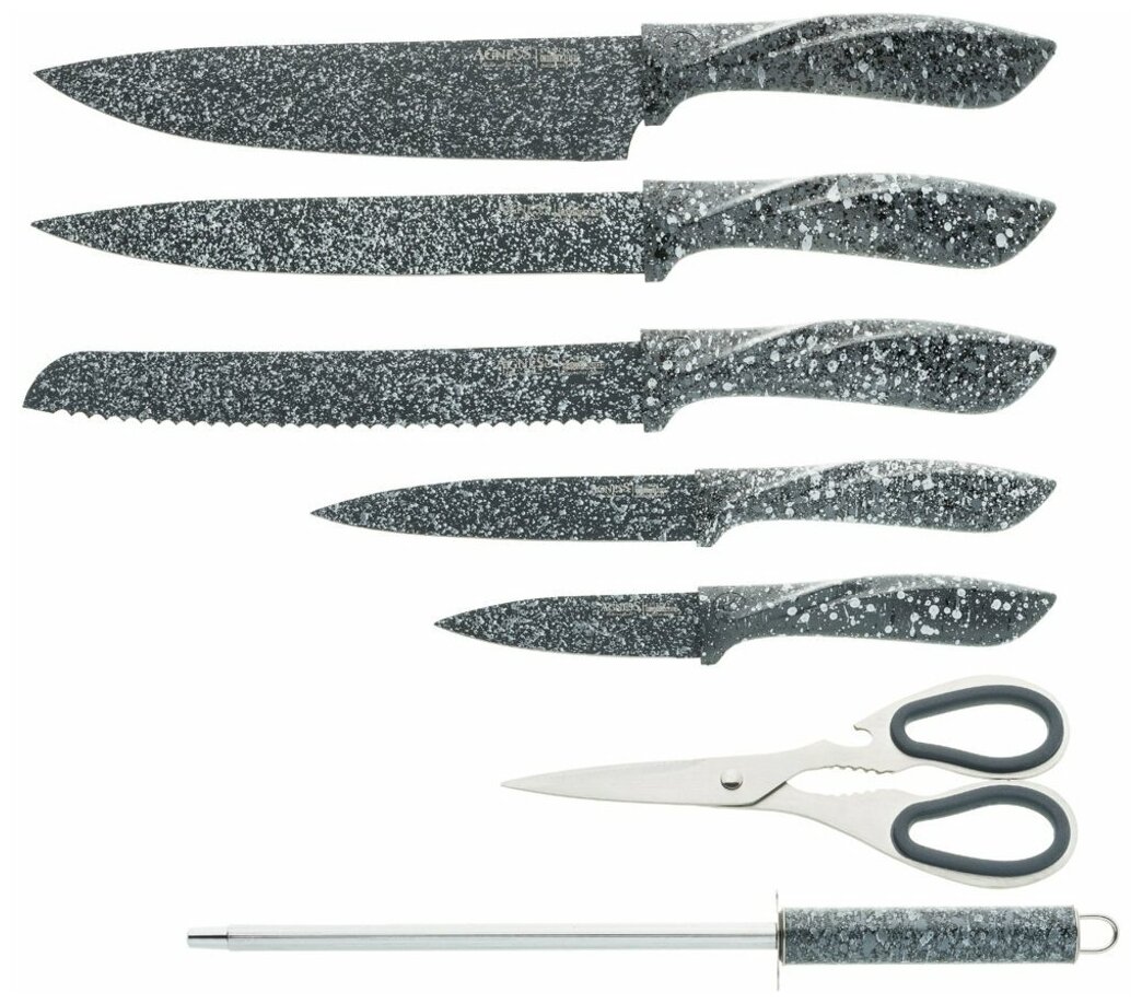 | Комплектация | нож поварской 20см, нож для хлеба 20см, нож для нарезки 20см, нож универсальный 12,5см, нож для чистки овощей и фруктов, 9см, муссат, ножницы, пластиковая подставка для безопасного хранения ножей |