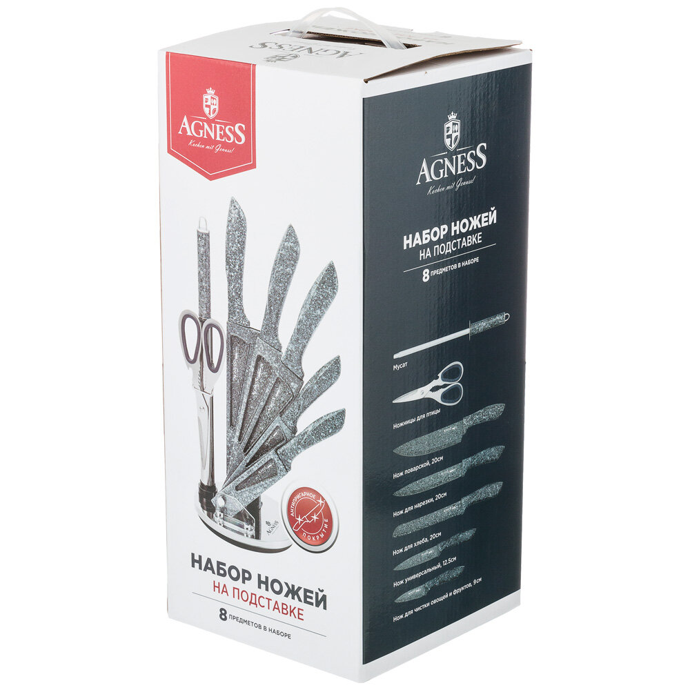 Набор ножей Agness "Монблан" с ножницами и мусатом на вращающейся платиковой подставке, 8 предметов
