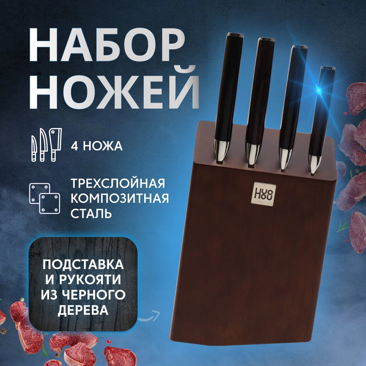 Отзывы на Набор стальных ножей (4 ножа + подставка) HuoHou Composite Steel Kitchen Knife Set (HU0033), русская версия!!!, черный