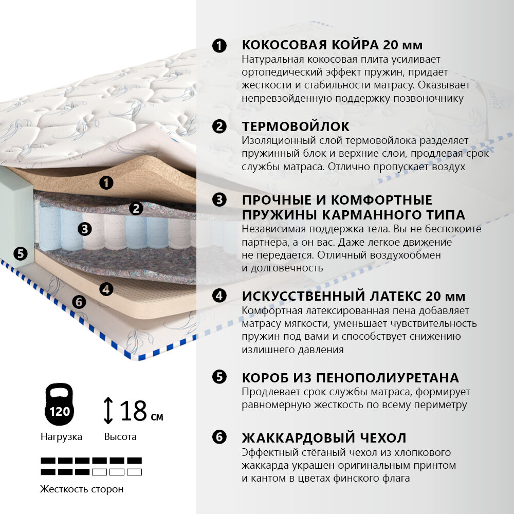 Матрас Corretto Suomi Line Koski с независимыми пружинами 80х180 см информация: