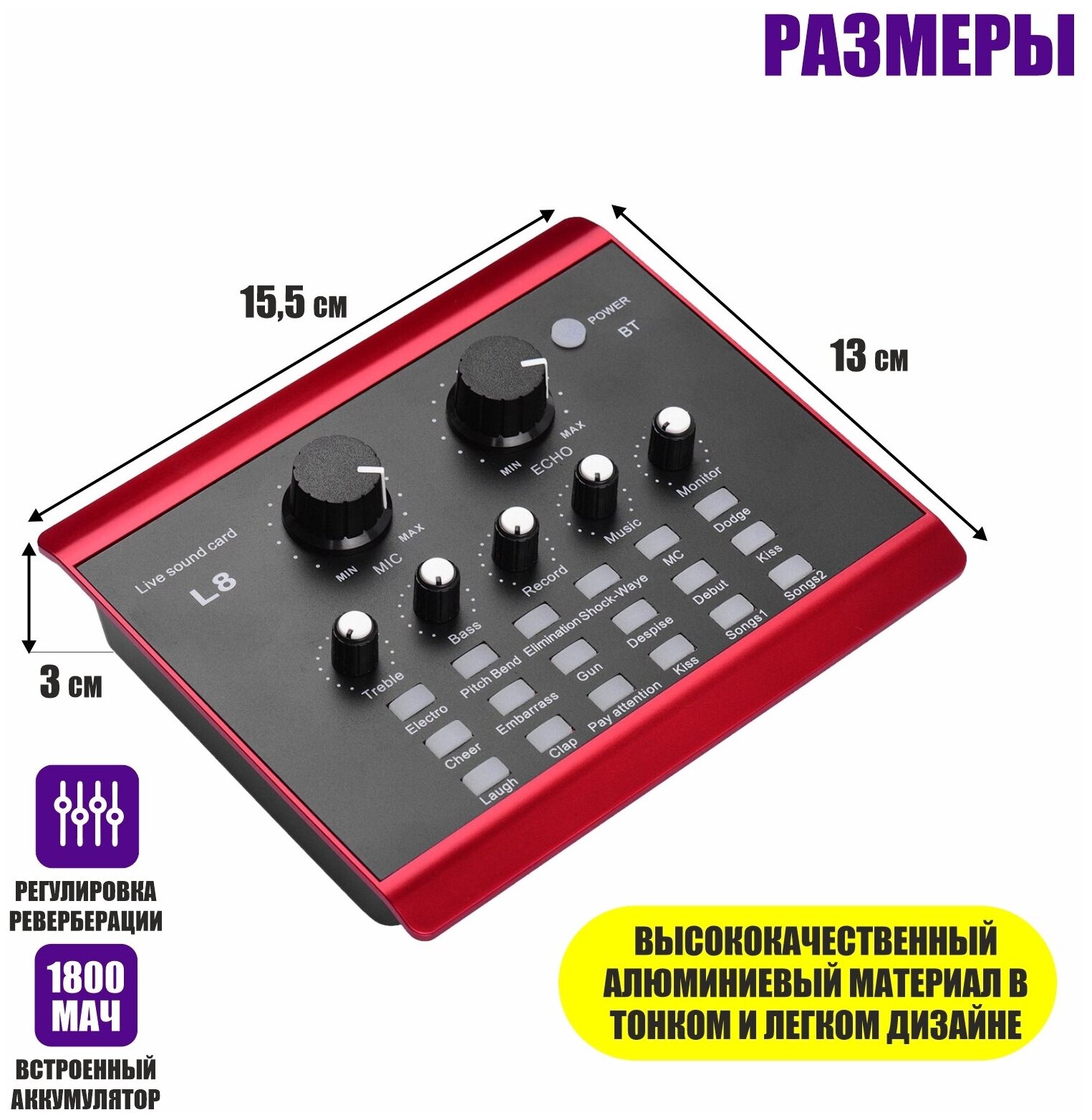 | Подробная комплектация | - Звуковая карта L8 - 1 шт; - USB кабель для зарядки type-c - 1 шт; - Аудио кабель Type C mini jack 3.5 переходник - 2 шт - Микрофон E300 - 1 шт; - Микрофонный кабель - 1 шт; - Подставка стойка для микрофона - 1 шт; - Держатель для микрофона - 1 шт; - Наушники - 1 шт; - Алюминиевый чемодан для переноски - 1 шт. |