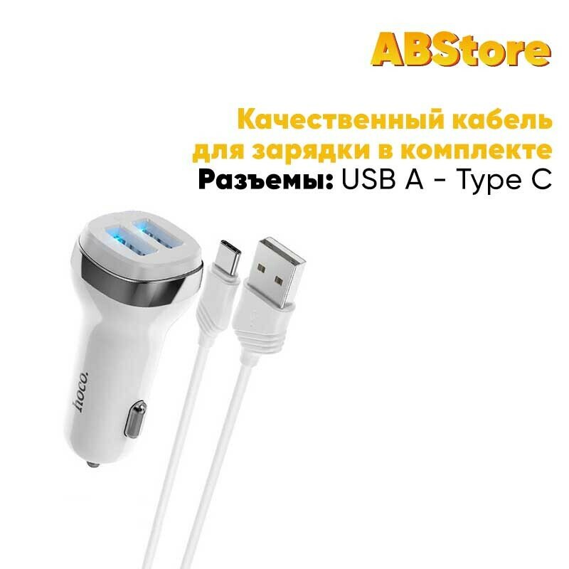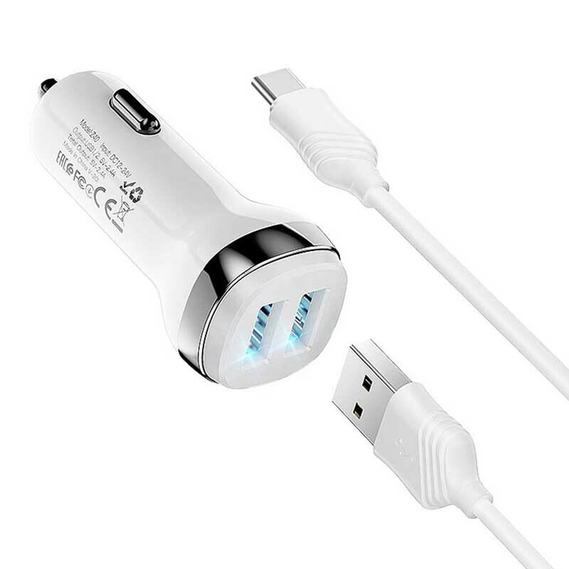 Автомобильное зарядное устройство с двумя USB + кабель 1m Type c Hoco Z40 белый информация: