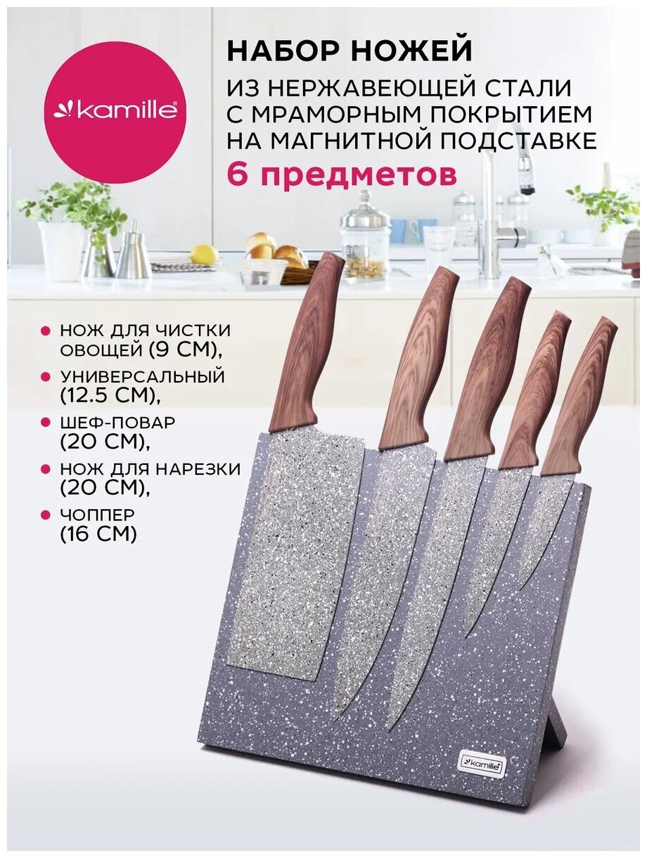 10 цен на Набор ножей 6 предметов из нержавеющей стали на подставке с мраморным покрытием (5 ножей+подставка)