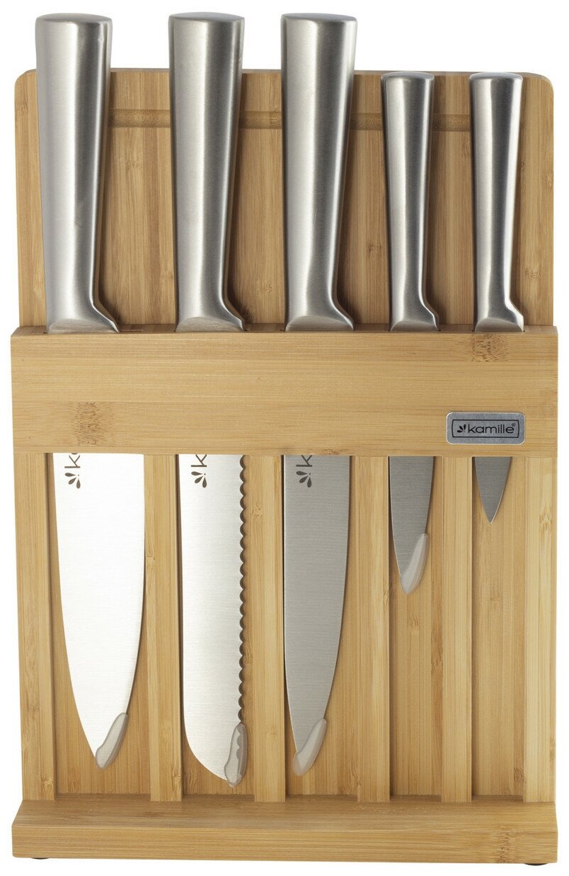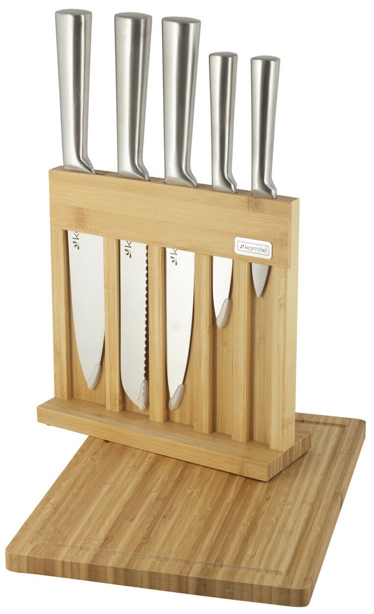 10 цен на Набор кухонный ножей на подставке из бамбука с разделочной доской Kamille KM-5168 из нержавеющей стали (6)