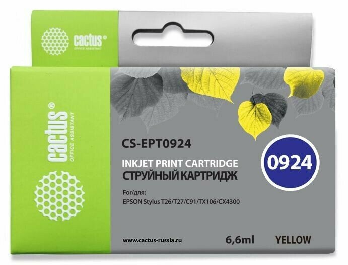 Картридж струйный Cactus CS-EPT0924 желтый (6.6мл) для Epson Stylus C91/CX4300/T26/T27/TX106/TX109/TX117/TX119 информация: