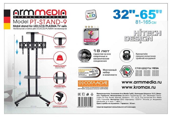 Подставка для телевизора Arm Media PT-STAND-9 черный 32"-65" макс.45кг напольный фиксированный 10233 информация: