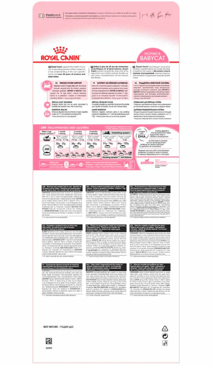 | Дополнительная информация | 1) поддержание иммунитета: С 4 по 12 неделю после рождения котенка естественный иммунитет, приобретенный с молозивом матери постепенно снижается. Корм MOTHER & BABYCAT помогает поддерживать естественную защиту новорожденных котят благодаря запатентованному* комплексу антиоксидантов, включающему витамин E. *Франция, патент №EP1146870; 2) Специально для периода отъема: Адаптированные крокеты, которые легко размачиваются для облегчения перевода котенка с молока на твердый корм; 3) Здоровая пищеварительная система: Повышенная усвояемость корма благодаря высокоусвояемым белкам (L.I.P.*) и пребиотикам (в том числе фруктоолигосахаридам). *Специально отобранные белки с высокой степенью усвояемости; 4) Содержит DHA: Жирные кислоты DHA стимулируют мозговое развитие котенка в период беременности и лактации. |