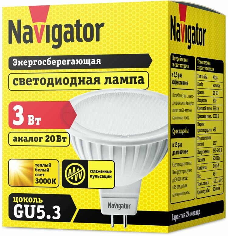 Отзывы на Лампа светодиодная 94 255 NLL-MR16-3-230-3K-GU5.3 3Вт 3000К тепл. бел. GU5.3 225лм 220-240В Navigator 94255