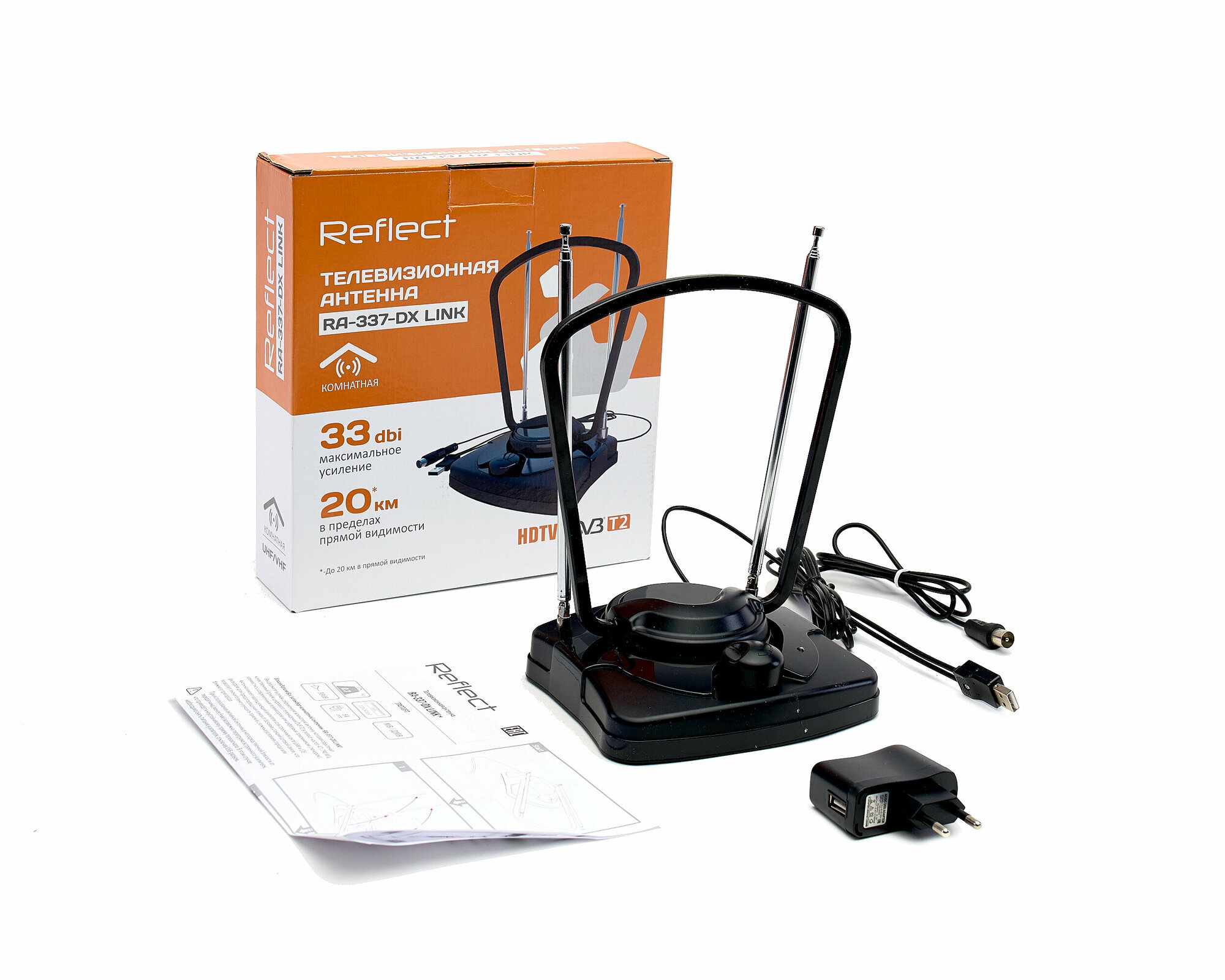 Антенны ТВ Reflect Антенна комнатная Reflect LINK RA-337-DX (активная, МВ-ДМВ, с б/п, 33 дБи, коробка)