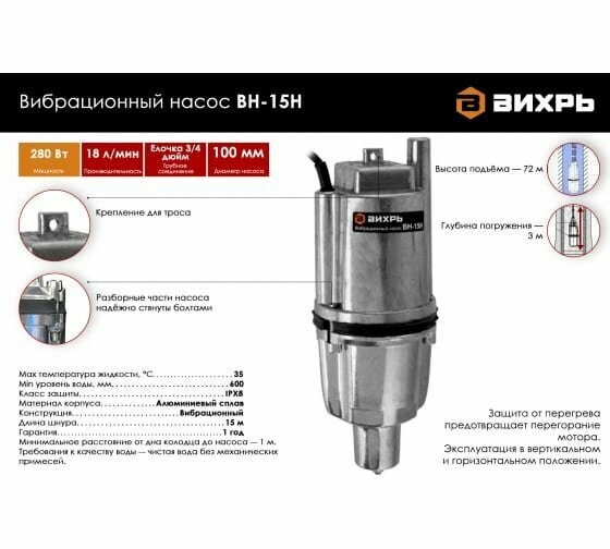Вихрь ВН-15Н Насос погружной вибрационный 280Вт 18л/мин. глубина погружения 3м подача 72м нижний забор вихрь
