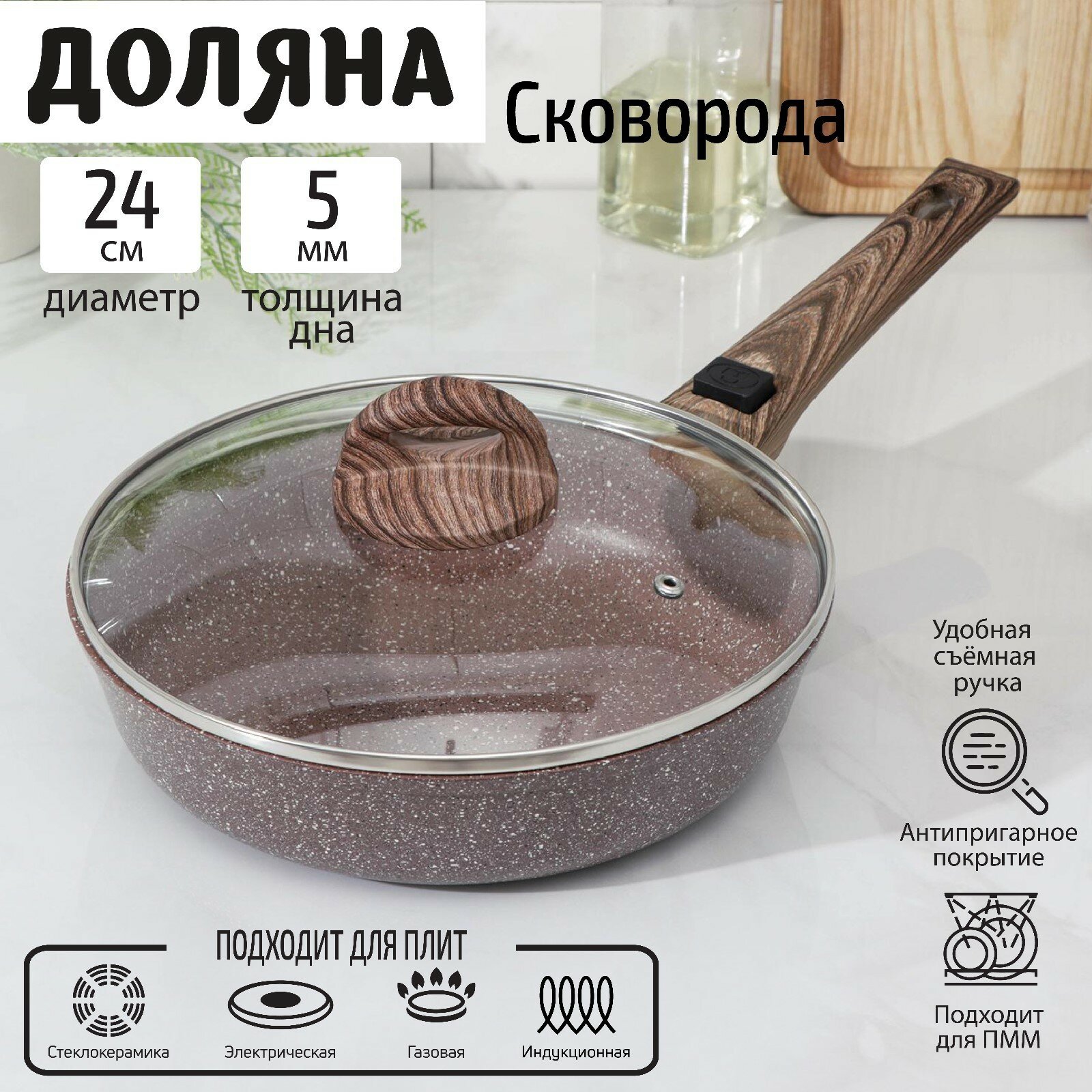 10 цен на Сковорода Доляна «Брауни», d=24 см, съёмная ручка, стеклянная крышка, индукция, антипригарное покрытие, цвет коричневый