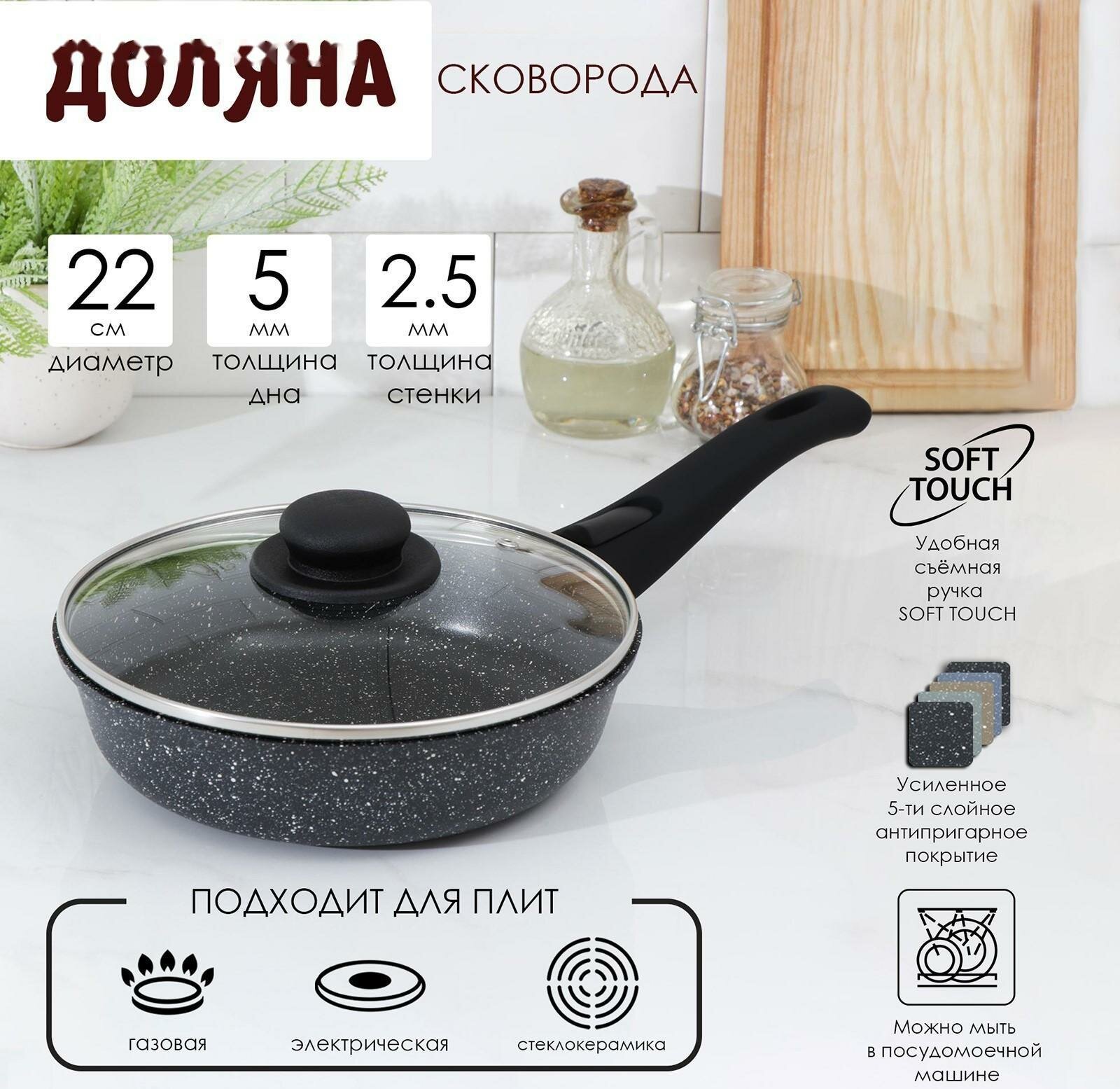 Сковорода Доляна «Элит», d=22 см, съёмная ручка, стеклянная крышка, антипригарное покрытие, цвет чёрный информация: