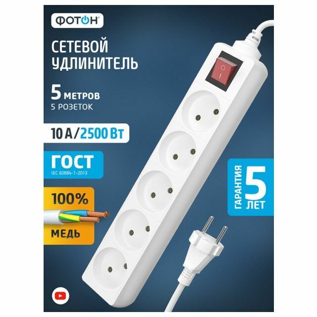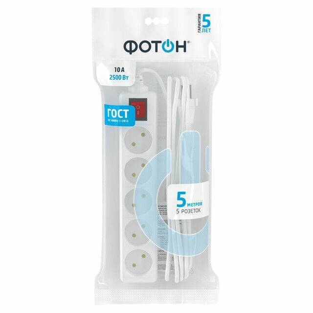 Отзывы на Удлинитель 5м 5-местный б/з с выключателем 10А для офиса 10-55S белый